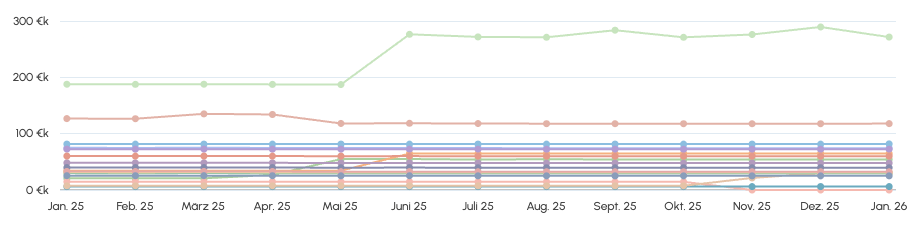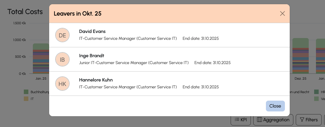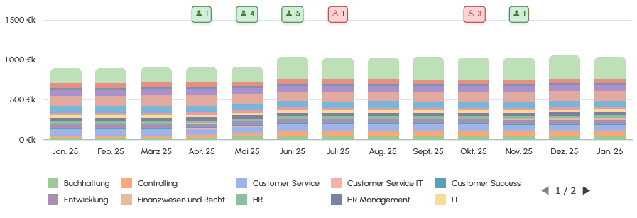 The scenario page shows a timeline of joiners/leavers directly integrated into your chart. To keep the chart clean, we show the number of joiners/leavers for each month. Those respect your chart settings, so when you filter for a certain department for example, it will show the joiners/leavers of that department only.