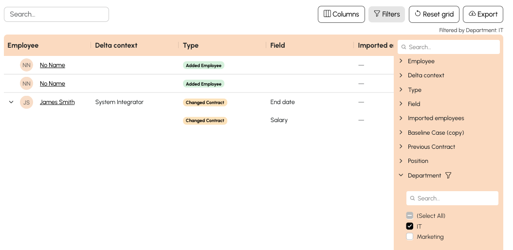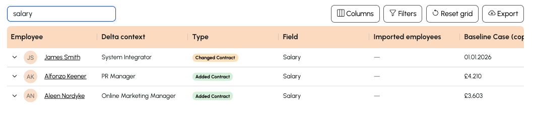 A quick search text field filters against all visible. You can use this to find a particular employee, but also for example to quickly review all salary changes: