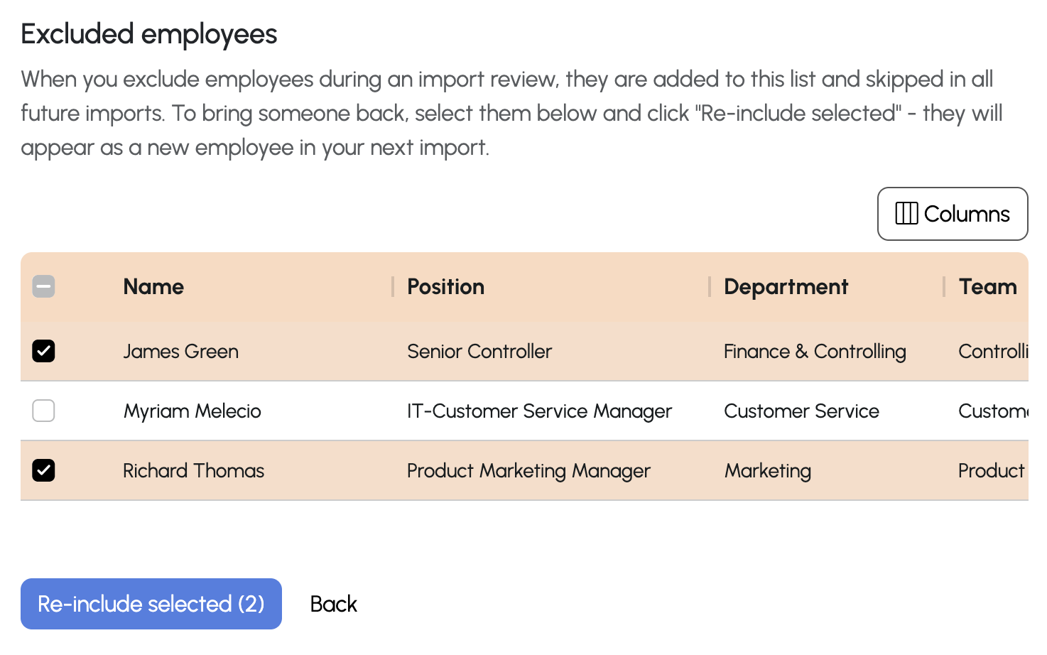 The import process allows you to exclude certain employees. Those excluded employees were ignored during subsequent re-imports to keep the re-import process lean. If you want to revert your decision however, you can do so now by re-including such employees. They will be shown on the subsequent re-import as new employees.